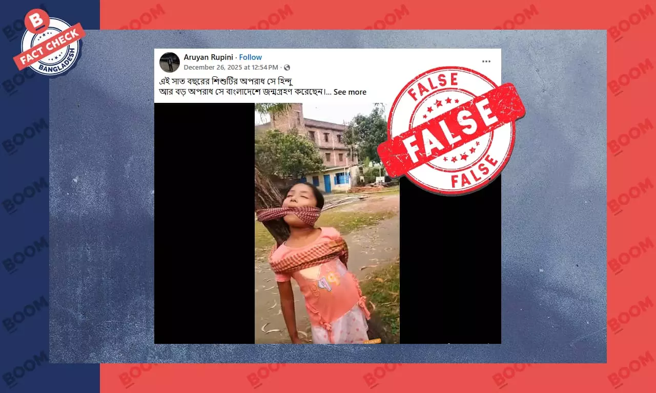 সামাজিক যোগাযোগ মাধ্যম ফেসবুকে মুখে গামছা পেচানো অবস্থায় একটি শিশুর ভিডিও পোস্ট করে বলা হচ্ছে; হিন্দু শিশুটিকে ধর্ষণের পর হত্যা করে গাছে ঝুলিয়ে রাখা হয়েছে। এরকম কয়েকটি পোস্ট দেখুন এখানে, এখানে ও এখানে।