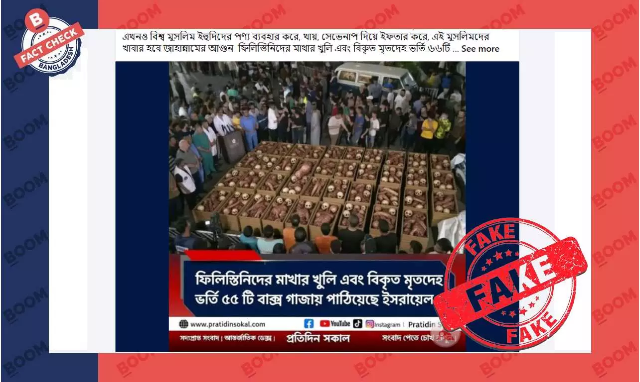সুতরাং এআই প্রযুক্তিতে তৈরি ছবিকে ইসরায়েলের পাঠানো ফিলিস্তিনিদের মাথার খুলি এবং বিকৃত মৃতদেহ ভর্তি বক্সের দৃশ্য দাবিতে প্রচার করা হচ্ছে ফেসবুকে, যা বিভ্রান্তিকর।