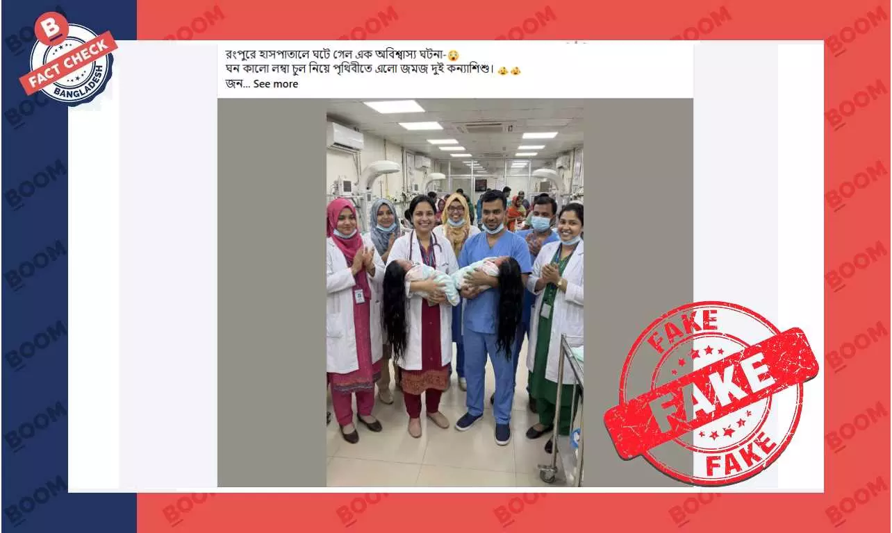 সামাজিক যোগাযোগ মাধ্যম ফেসবুকের বিভিন্ন আইডি ও পেজ থেকে চিকিৎসকদের হাতে জমজ শিশুর একটি ছবি পোস্ট করে দাবি করা হচ্ছে, রংপুর হাসপাতালে ঘন কালো লম্বা চুল নিয়ে জমজ দুই কন্যাশিশু জন্মগ্রহণ করেছেন। এরকম কয়েকটি পোস্ট দেখুন এখানে, এখানে, এখানে এবং এখানে।