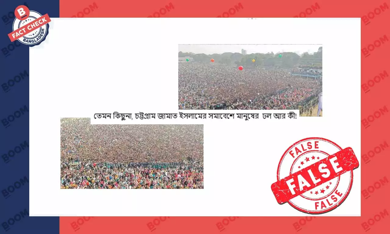 বুম বাংলাদেশ যাচাই করে দেখেছে, আলোচ্য পোস্টের দাবিটি সঠিক নয়। আলোচ্য ছবিটি জামায়াতে ইসলামীর সমাবেশের নয় বরং বাংলাদেশ জাতীয়তাবাদী দল (বিএনপি)-র সমাবেশের। তারেক রহমানের উপস্থিতিতে চট্টগ্রামে বিএনপির নির্বাচনি জনসভা চলাকালে গত ২৬ জানুয়ারি আলোচ্য ছবিটি ধারণ করা হয়।