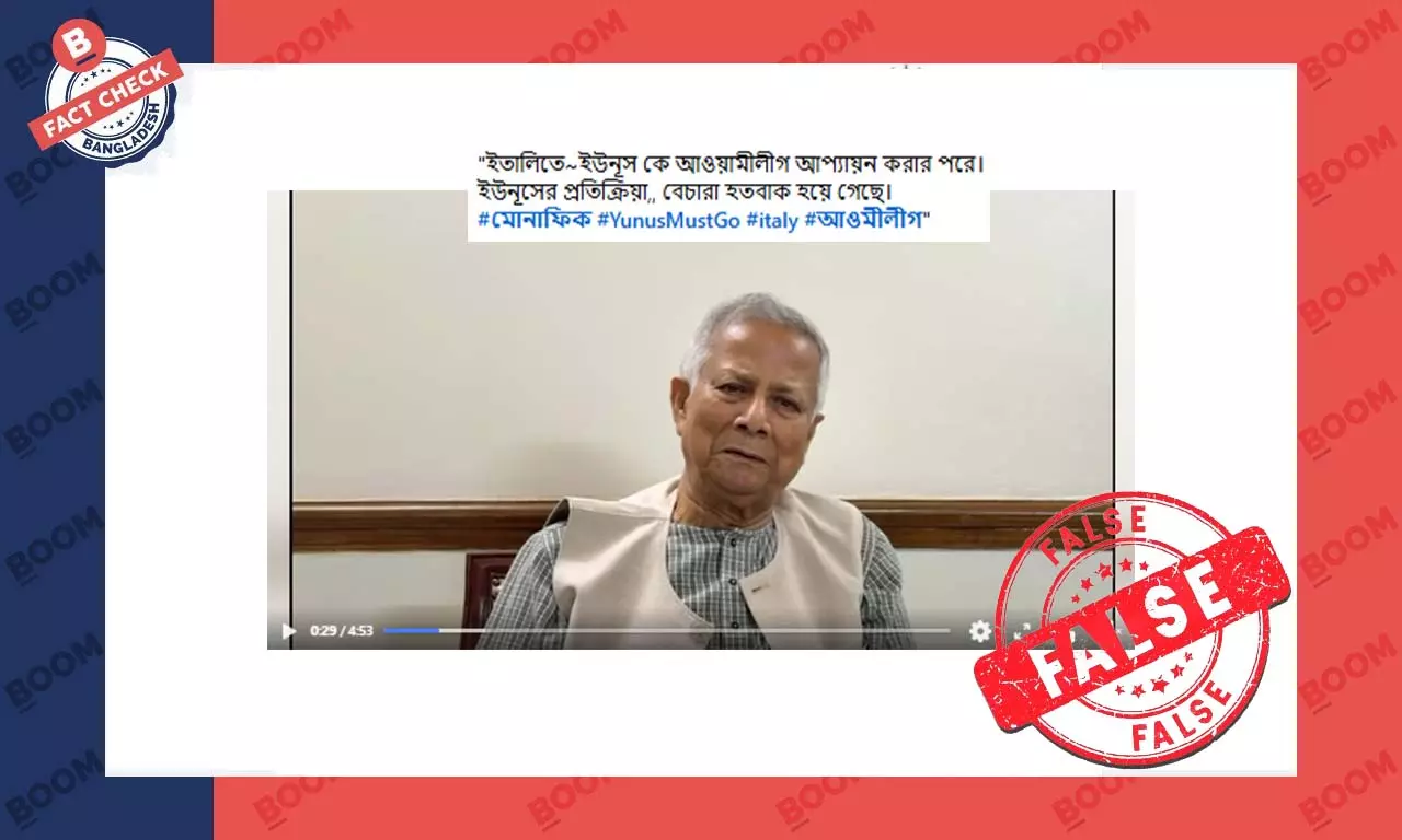 সামাজিক মাধ্যম ফেসবুকে প্রধান উপদেষ্টা মুহাম্মদ ইউনূসের কথা বলার একটি ভিডিও শেয়ার করে বলা হচ্ছে, ইতালিতে সফররত অবস্থায় তার উপর আওয়ামী লীগের হামলার পরে ওই বক্তব্য দেন তিনি। এরকম কয়েকটি ফেসবুক পোস্ট দেখুন এখানে, এখানে ও এখানে।