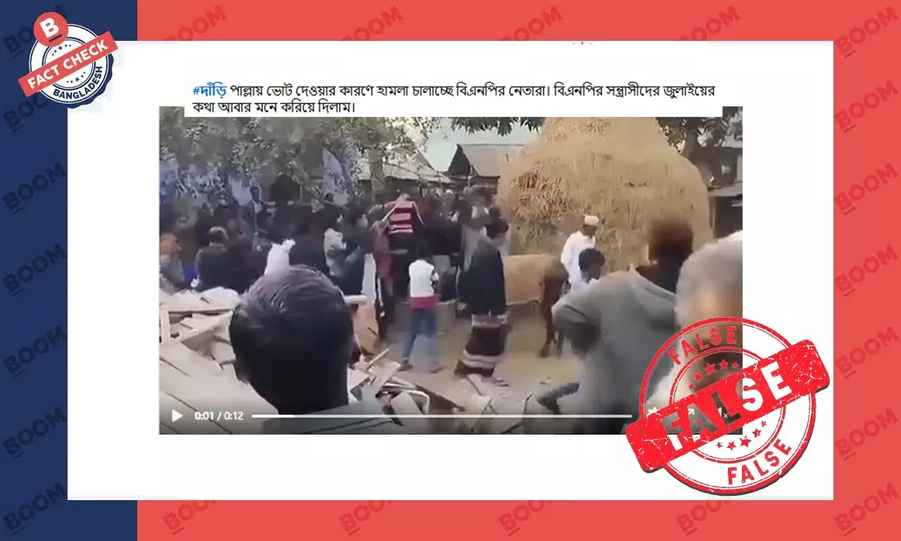 বুম বাংলাদেশ যাচাই করে দেখেছে, আলোচ্য পোস্টের দাবিটি সঠিক নয়। নির্বাচনের আগের জামায়াত বনাম বিএনপির সংঘর্ষের একটি ভিডিওকে নির্বাচন অনুষ্ঠিত হওয়ার পরে সংঘটিত জামায়াতের উপরে বিএনপির হামলার বলে প্রচার করা হচ্ছে।