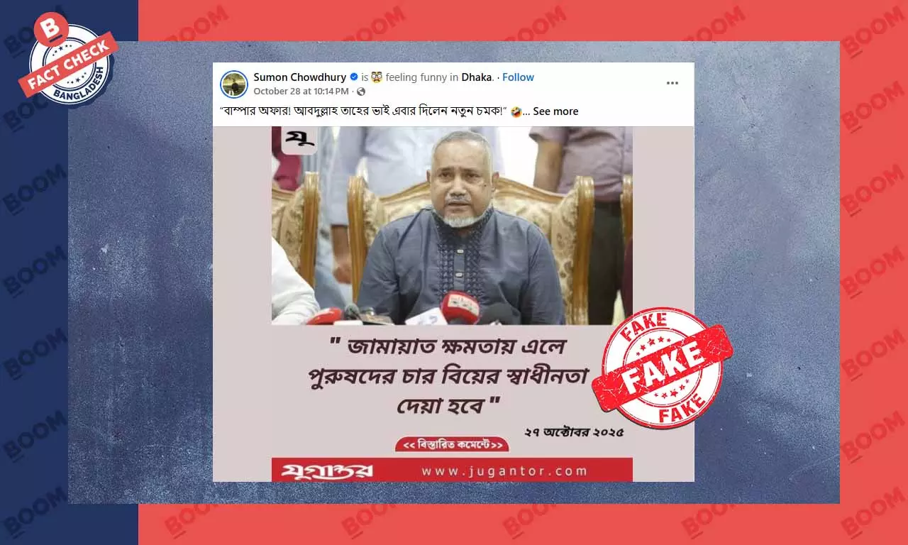 সামাজিক মাধ্যম ফেসবুকে একটি ফটোকার্ড পোস্ট করে বলা হচ্ছে, দৈনিক যুগান্তর জামায়াতের নায়েবে আমীর সৈয়দ আব্দুল্লাহ মোহাম্মদ তাহেরের মন্তব্য “জামায়াত ক্ষমতায় এলে পুরুষদের চার বিয়ের স্বাধীনতা দেওয়া হবে" নিয়ে একটি ফটোকার্ড প্রচার করেছে। এরকম কয়েকটি ফেসবুক পোস্ট দেখুন এখানে, এখানে ও এখানে।