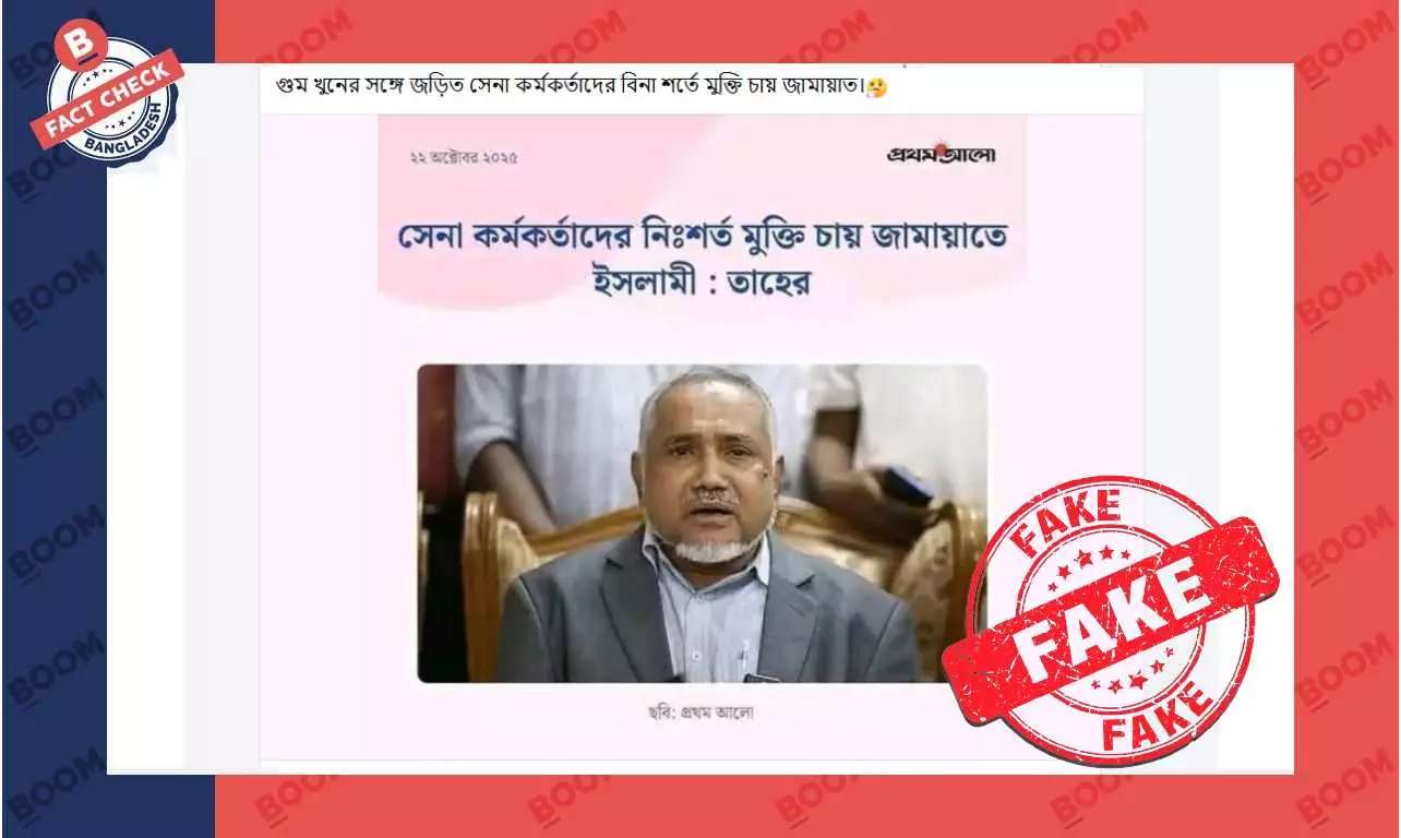 সামাজিক যোগাযোগ মাধ্যম ফেসবুকের বিভিন্ন আইডি ও পেজ থেকে জাতীয় দৈনিক প্রথম আলোর লোগোযুক্ত একটি ফটোকার্ড পোস্ট করে দাবি করা হচ্ছে, গুম খুনের সঙ্গে জড়িত সেনা কর্মকর্তাদের বিনা শর্তে মুক্তি চেয়েছেন জামায়াত ইসলামীর নায়েবে আমির ডা. সৈয়দ আব্দুল্লাহ মোহাম্মাদ তাহের। এরকম কয়েকটি পোস্ট দেখুন এখানে এবং এখানে।