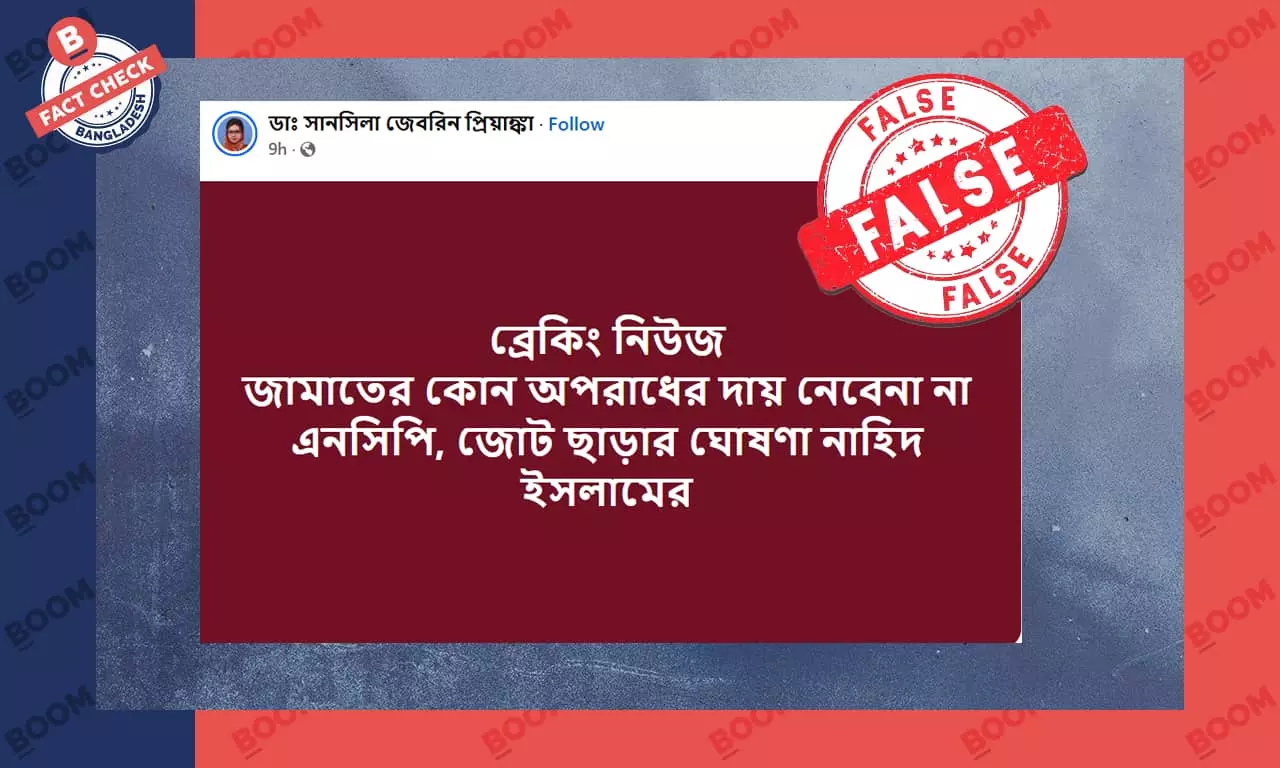 সুতরাং ভিত্তিহীন ফটোকার্ড বানিয়ে নাহিদ ইসলামের নামে ভুয়া মন্তব্য যুক্ত করে এনসিপি জোট ছাড়ার বিভ্রান্তিকর তথ্য প্রচার করা হচ্ছে।