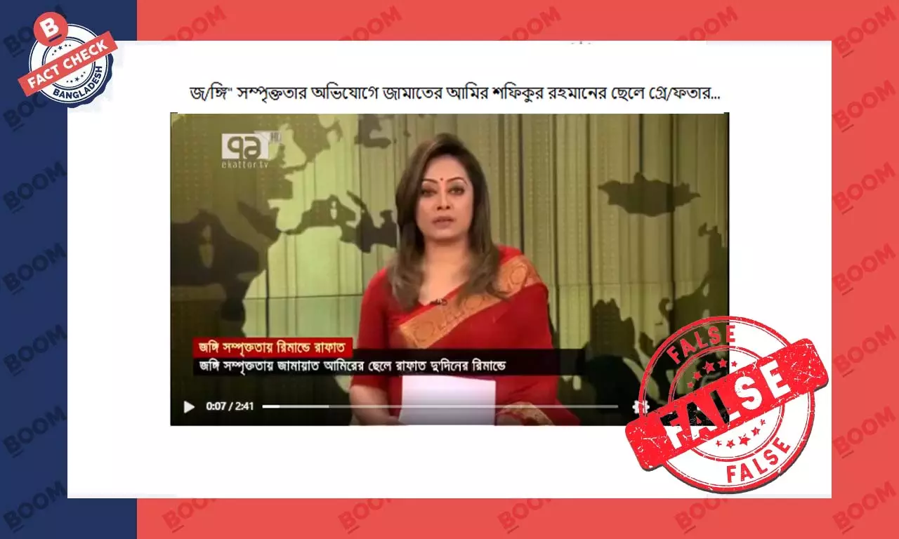 আলোচ্য ভিডিওটির উপরের দিকে বেসরকারি সম্প্রচার মাধ্যম একাত্তর টেলিভিশনের লোগো দেখতে পাওয়া যায়। ভিডিওটি সম্পর্কে জানতে কি-ওয়ার্ড সার্চ করে একাত্তর টেলিভিশনের ইউটিউব চ্যানেলে ২০২২ সালের ১০ নভেম্বর "জ' ঙ্গি সম্পৃক্ততার অভিযোগে রিমান্ডে জামায়াত আমিরের ছেলে রাফাত | News | Ekattor TV" শিরোনামে প্রচারিত আলোচ্য ভিডিওটির মত একটি ভিডিও খুঁজে পাওয়া যায়। ওই ভিডিওটি থেকে জানা যায়, ২০২২ সালের ৯ নভেম্বর সিলেট থেকে রাফাত সাদিক শফিকুল্লাহকে গ্রেপ্তার করে ঢাকা মহানগর পুলিশের সন্ত্রাসবাদ ও আন্তদেশীয় অপরাধ দমন বিভাগ। ইউটিউব ভিডিওটি দেখুন--