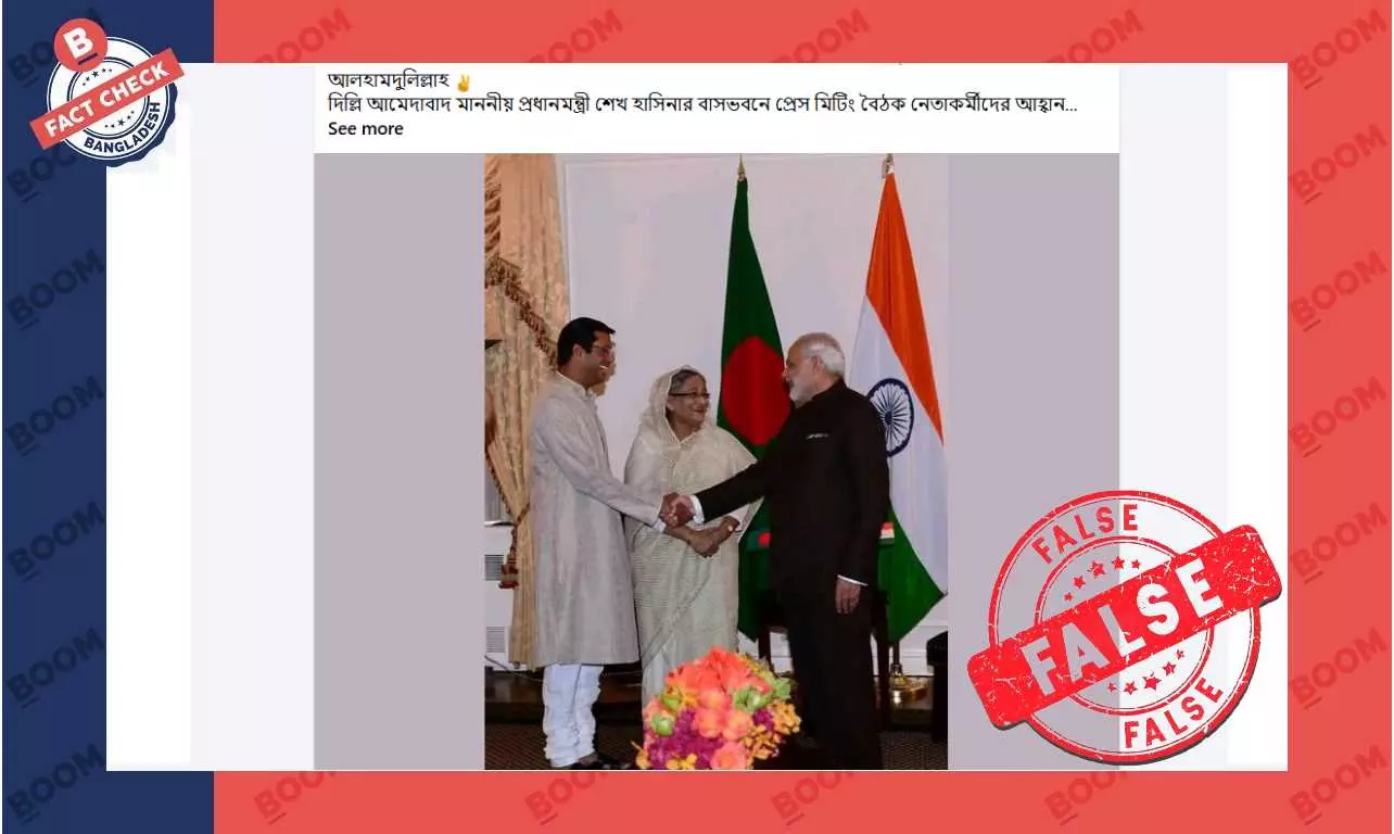 বুম বাংলাদেশ যাচাই করে দেখেছে, আলোচ্য দাবিটি সঠিক নয়। আলোচ্য ছবিটি দিল্লির আহমেদাবাদে শেখ হাসিনা ও তাঁর ছেলে সজীব ওয়াজেদ জয়ের সঙ্গে ভারতীয় প্রধানমন্ত্রী নরেন্দ্র মোদির সম্প্রতি সাক্ষাতকারের নয় বরং এটি ২০১৫ সালের সেপ্টেম্বরে জাতিসংঘের সাধারণ পরিষদের ৭০ তম অধিবেশনে যুক্তরাষ্ট্রের নিউইয়র্কে অনুষ্ঠিত বৈঠকের ছবি।
