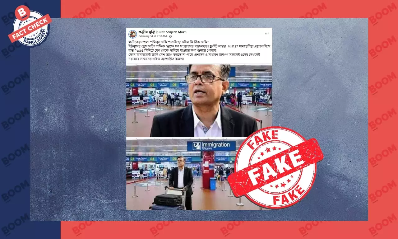 সামাজিক যোগাযোগ মাধ্যম ফেসবুকে দুইটি ছবির কোলাজ পোস্ট করা হয়েছে; এতে বাংলাদেশের বিদায়ী অন্তর্বর্তীকালীন সরকারের প্রধান উপদেষ্টার প্রেস সচিব শফিকুল আলম বিমানবন্দরে লাগেজ সহ দেখা যাচ্ছে। পোস্টে দাবি করা হয়েছে, শফিকুল আলম শাহজালাল আন্তর্জাতিক বিমানবন্দরের ভিআইপি লাউঞ্জে মালয়েশিয়া এয়ারলাইন্সের একটি ফ্লাইটে দেশত্যাগের জন্য অপেক্ষা করছেন। এ ধরনের পোস্ট দেখুন এখানে, এখানে ও এখানে।
