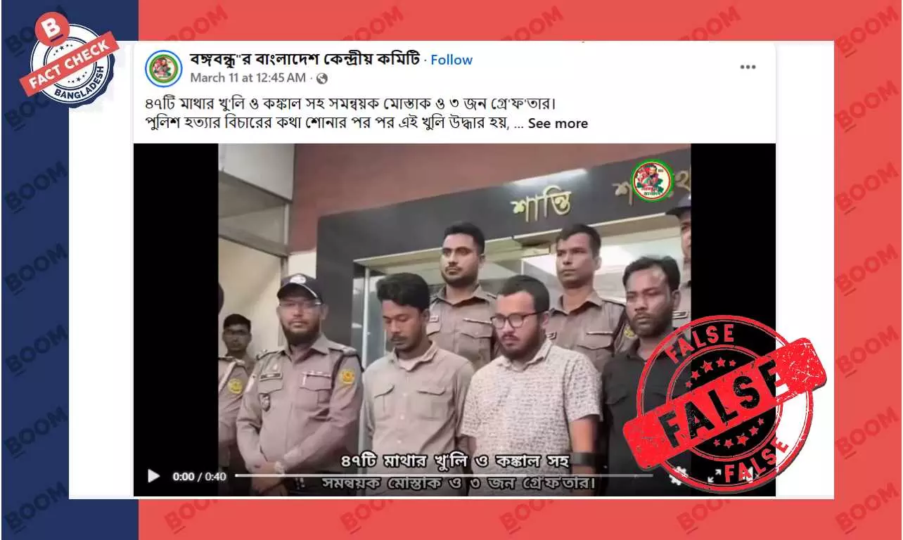গত ১১ মার্চ ‘বঙ্গবন্ধু"র বাংলাদেশ কেন্দ্রীয় কমিটি’ নামক একটি পেজ থেকে ভিডিওটি পোস্ট করে উল্লেখ করা হয়, “৪৭টি মাথার খু'লি ও কঙ্কাল সহ সমন্বয়ক মোস্তাক ও ৩ জন গ্রে'ফ'তার। পুলিশ হত্যার বিচারের কথা শোনার পর পর এই খুলি উদ্ধার হয়, বিভিন্ন শ্রেণি পেশার মানুষ মন্তব্য করছেন জুলাই আগস্ট জঙ্গি হামলায় যে পুলিশ নিহত হয়েছিল তাদেরই খুলি এবং কঙ্কাল হতে পারে।” নিচে পোস্টটির স্ক্রিনশট দেখুন--