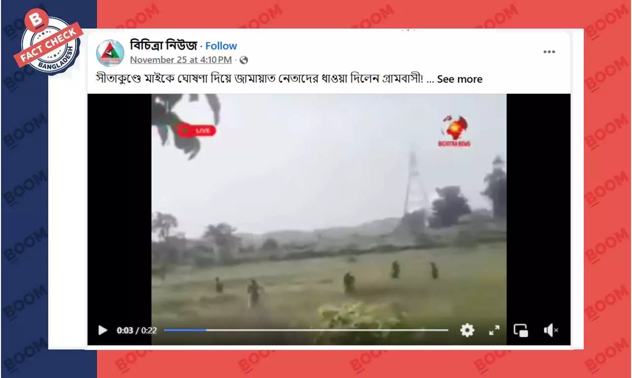 সামাজিক যোগাযোগ মাধ্যম ফেসবুকের বিভিন্ন আইডি ও পেজ থেকে দুপক্ষের ধাওয়া-পাল্টা ধাওয়ার একটি ভিডিও পোস্ট করে দাবি করা হচ্ছে, চট্টগ্রামের সীতাকুণ্ডে মাইকে ঘোষণা দিয়ে জামায়াত নেতাদের ধাওয়া দিল গ্রামবাসী। এরকম কয়েকটি পোস্ট দেখুন এখানে, এখানে, এখানে, এখানে এবং এখানে।