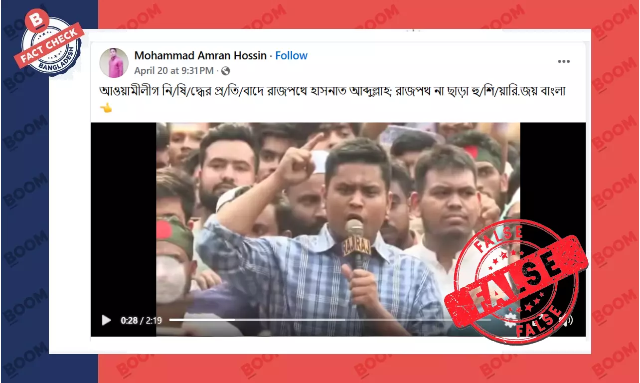 সামাজিক যোগাযোগ মাধ্যম ফেসবুকের বিভিন্ন আইডি ও পেজ থেকে এনসিপি নেতা ও সংসদ সদস্য হাসনাত আব্দুল্লাহর বক্তব্যের একটি ভিডিও পোস্ট করে দাবি করা হচ্ছে, আওয়ামীলীগ নিষিদ্ধের প্রতিবাদে রাজপথে বিক্ষোভ মিছিল করেছেন তিনি। এরকম কয়েকটি পোস্ট দেখুন এখানে এবং এখানে।