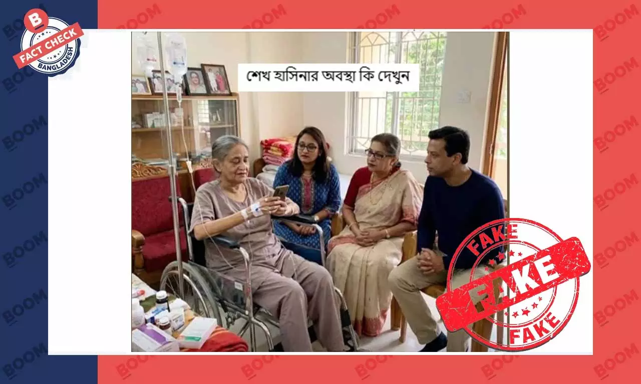 সামাজিক মাধ্যম ফেসবুকে সাবেক প্রধানমন্ত্রী শেখ হাসিনার একটি ছবি শেয়ার করে বলা হচ্ছে, ছবিটি শেখ হাসিনার অসুস্থ হয়ে হাসপাতালে ভর্তি থাকা অবস্থায় ধারণ করা হয়েছে। এরকম দুটি ফেসবুক পোস্ট দেখুন এখানে ও এখানে।