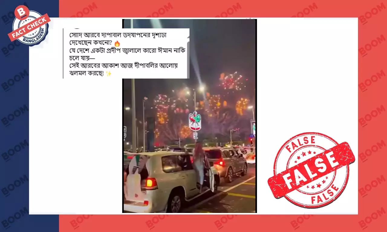 বুম বাংলাদেশ যাচাই করে দেখেছে, ২০২৩ সালের ডিসেম্বর মাসে দুবাইয়ের জাতীয় দিবস পালনের সময়ে আলোচ্য ভিডিওটি ধারণ করা হয়। দুবাইয়ের সেই ভিডিওকে আলোচ্য পোস্টে সৌদি আরবে দীপাবলি পালনের ভিডিও বলে প্রচার করা হচ্ছে।