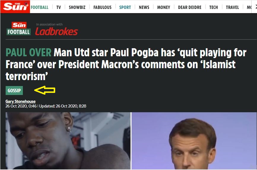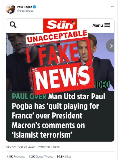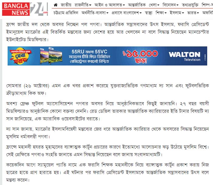 বাংলাদেশের মূলধারার সংবাদমাধ্যমে সোমবার একটি খবর প্রকাশিত হয়েছে; যাতে দাবি করা হয়েছে, ফ্রান্স জাতীয় ফুটবল দলের খেলোয়াড় পল পগবা ঘোষণা দিয়েছেন তিনি আর ফ্রান্স দলের হয়ে খেলবেন না। ফ্রান্সের প্রেসিডেন্ট ইমানুয়েল ম্যাকরন ইসলাম সংক্রান্ত আপত্তিকর বক্তব্য দিয়েছেন বলেই নাকি তার এমন সিদ্ধান্ত- সেটাও দাবি করা হয় এসব খবরে।