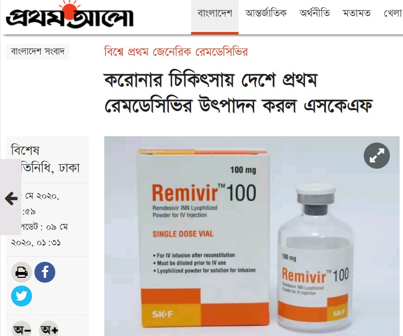 দৈনিক প্রথম আলো গত ৮ মে একটি প্রতিবেদন প্রকাশ করেছে যার শিরোনাম, "করোনার চিকিৎসায় দেশে প্রথম রেমডেসিভির উৎপাদন করল এসকেএফ"।