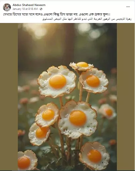 গত ১৮ জানুয়ারি 'Abdus Shaheed Naseem' নামে একটি ফেসবুক আইডি থেকে ডিমের মত দেখতে একটি ফুলের ছবি পোস্ট করে লেখা হয়, "দেখতে ডিমের মতো মনে হলেও এগুলো কিন্তু ডিম ভাজা নয়, এগুলো এক প্রকার ফুল!!!"। ফেসবুক পোস্টটির স্ক্রিনশট দেখুন--