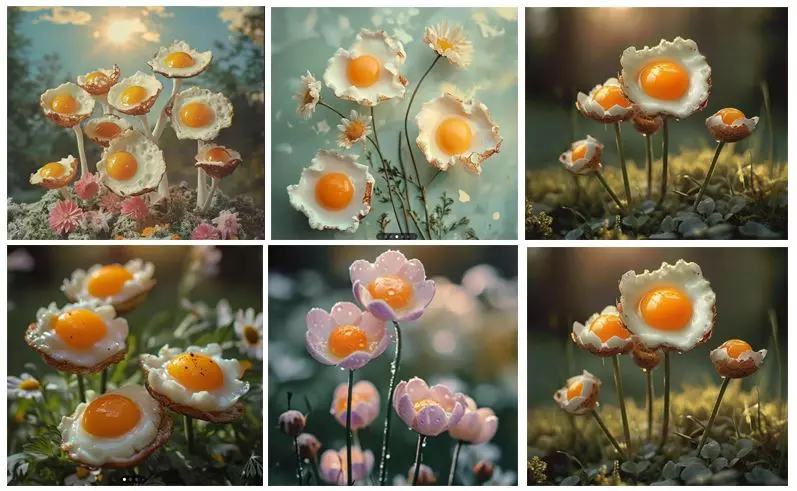 এদিকে আরো সার্চ করে সামাজিক মাধ্যম reddit এর মিডজার্নি নির্মিত এআই সংশ্লিষ্ট কনটেন্ট ভিত্তিক একটি গ্রুপ 'r/midjourney' তে 'Angiebio' নামের একটি আইডি থেকে মাস খানেক আগে করা একটি পোস্ট খুঁজে পাওয়া যায়। যেখানে মিডজার্নিতে নির্মিত দেখতে ডিমের (ওমলেট) মত এমন বেশ কয়েক ধরণের এআই নির্মিত ফুলের ছবি পোস্ট করা হয়, এই ছবিগুলোর সাথেও আলোচ্য ছবিটির বৈশিষ্টগত মিল রয়েছে। উক্ত পোস্ট থেকে নেয়া বেশ কয়েকটি এআই নির্মিত ডিমের মত দেখতে ফুলের ছবির কোলাজ দেখুন--