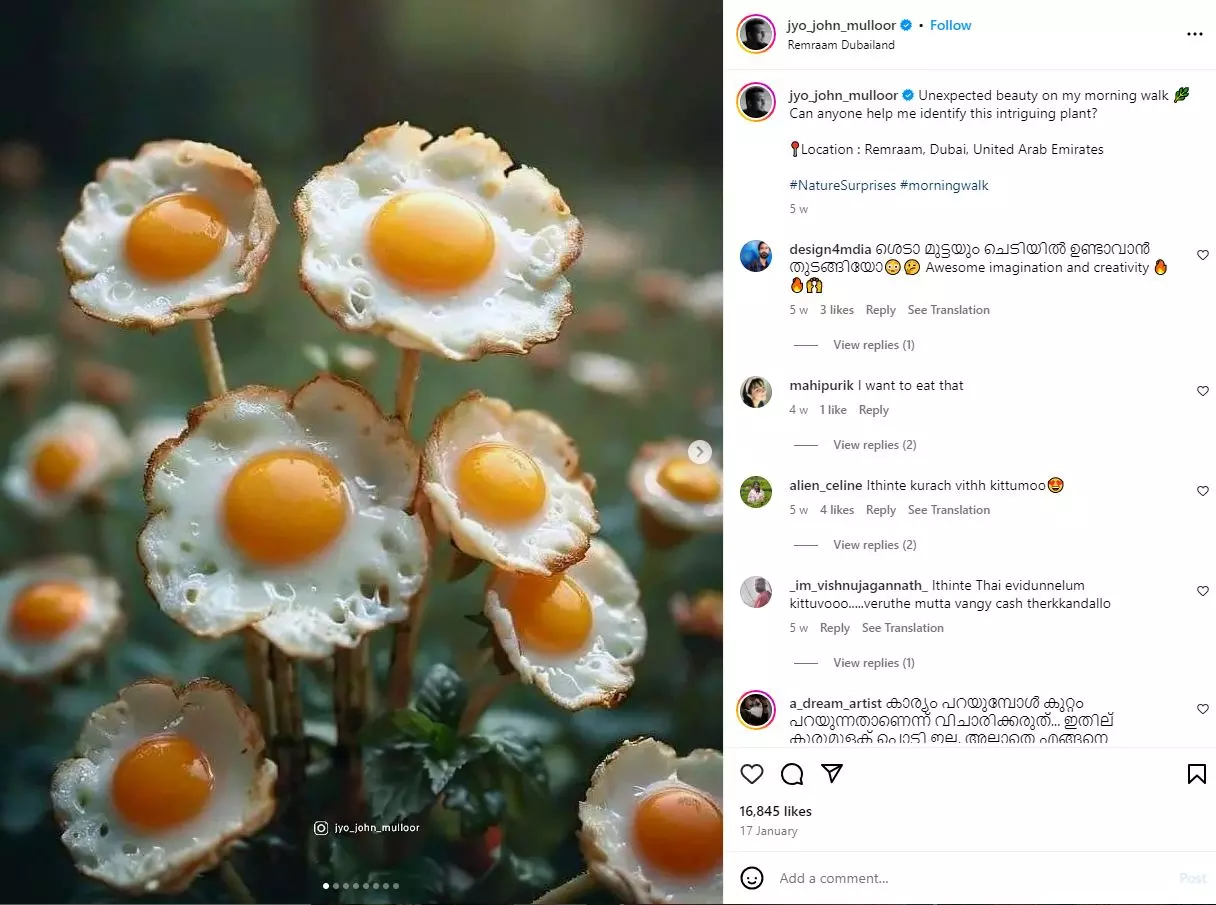 একই সার্চে সামাজিক মাধ্যম ইনস্টাগ্রামে 'jyo_john_mulloor' নামের একটি ভেরিফায়েড একাউন্ট থেকে গত ১৭ জানুয়ারি করা একটি পোস্টে আলোচ্য ফুলের ছবিটি মত একটি ছবি (হুবহু এক নয়) খুঁজে পাওয়া যায়। উক্ত ইনস্টাগ্রাম একাউন্টে ব্যক্তির পরিচয় হিসেবে 'Artificial Intelligence Trainer' এবং তিনি একটি এআই স্টুডিওর প্রতিষ্ঠাতা হিসেবে উল্লেখ করা হয়। এই ব্যক্তির একাউন্টে বিভিন্ন সময়ে পোস্ট করা অসংখ্য এআই নির্মিত ছবি পাওয়া যায়। তার ইনস্টাগ্রাম প্রোফাইলের স্ক্রিনশট দেখুন--