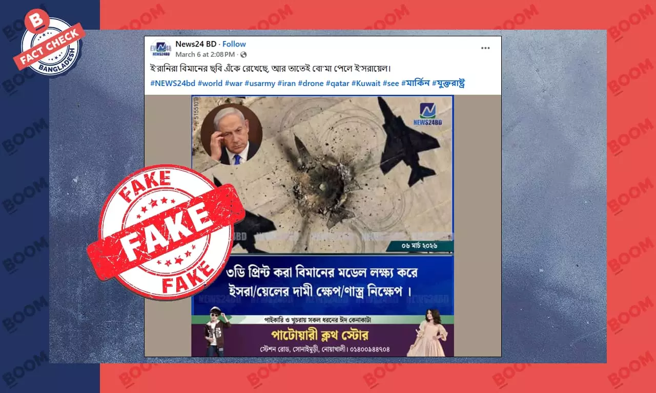গত ৬ মার্চ ‘News24 BD’ নামক পেজ থেকে ছবিটি সহ একটি সংবাদের ফটোকার্ড পোস্ট করা হয়। পোস্টে উল্লেখ করা হয়, “ই'রানিরা বিমানের ছবি এঁকে রেখেছে, আর তাতেই বো'মা পেলে ই'সরায়েল”(বানান অপরিবর্তিত)। পোস্টটির স্ক্রিনশট দেখুন--