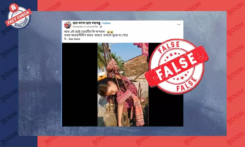 গত ২১শে ডিসেম্বর ‘জয় বাংলা জয় বঙ্গবন্ধু’ নামক একটি ফেসবুক অ্যাকাউন্ট থেকে ভিডিওটি পোস্ট করা হয়। পোস্টে উল্লেখ করা হয়, “আহা এই ছোট্ট মেয়েটির কি অপরাধ? ... বাবায় আওয়ামীলীগ করার কারণে, বাবাকে খুজে না পেয়ে মেয়েটিকে মেরে বাসার চাদে রডের সাথে গামচা দিয়ে ফাশ দিয়ে রেখে যায় বিএনপির সন্ত্রাসীরা ..." (বানান অপরিবর্তিত)। পোস্টটির স্ক্রিনশট দেখুন--