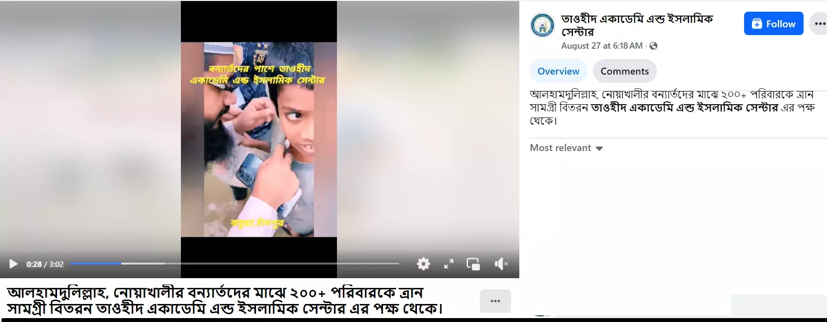 ভিডিওটি থেকে কি-ফ্রেম জেনারেট করে রিভার্স ইমেজ সার্চ এর মাধ্যমে সামাজিক মাধ্যম ফেসবুকে 'তাওহীদ একাডেমি এন্ড ইসলামিক সেন্টার'-নামের একটি পেজে গত ২৭ আগস্ট প্রকাশিত আলোচ্য ভিডিওটি সহ অন্যান্য কয়েকটি ভিডিওর সমন্বয়ে তৈরিকৃত একটি ভিডিও পাওয়া যায়। এতে উল্লেখ করা হয়, নোয়াখালীতে বন্যার্তদের মাঝে ২০০ এর বেশি পরিবারকে ত্রান সামগ্রী বিতরণ করা হয় তাওহীদ একাডেমি এন্ড ইসলামিক সেন্টার এর পক্ষ থেকে। পোস্টটির (ভিডিও) স্ক্রিনশট দেখুন--