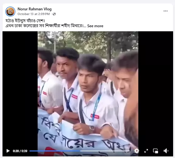 গত ১৩ অক্টোবর 'Norur Rahman Vlog' নামে একটি ফেসবুক একাউন্ট থেকে ভিডিওটি শেয়ার করে বলা হয়, "হঠাও ইউনুস বাঁচাও দেশ। এখন ঢাকা কলেজের সব শিক্ষার্থীরা শহীদ মিনারে। ছাত্র ও শিক্ষক দ্বারা কানায় কানায় পূর্ণ শহীদ মিনার।"। স্ক্রিনশট দেখুন--