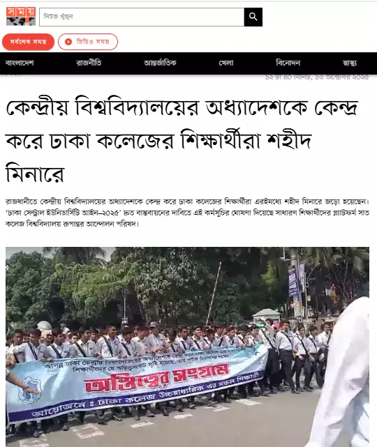 আরো সার্চ করে বেসরকারি সম্প্রচার মাধ্যম সময় টিভির অনলাইন ভার্সনে গত ১৩ অক্টোবর "কেন্দ্রীয় বিশ্ববিদ্যালয়ের অধ্যাদেশকে কেন্দ্র করে ঢাকা কলেজের শিক্ষার্থীরা শহীদ মিনারে" শিরোনামে একটি প্রতিবেদন খুঁজে পাওয়া যায়। ওই প্রতিবেদনে বলা হয়, "রাজধানীতে কেন্দ্রীয় বিশ্ববিদ্যালয়ের অধ্যাদেশকে কেন্দ্র করে ঢাকা কলেজের শিক্ষার্থীরা এরইমধ্যে শহীদ মিনারে জড়ো হয়েছেন। ‘ঢাকা সেন্ট্রাল ইউনিভার্সিটি আইন–২০২৫’ দ্রুত বাস্তবায়নের দাবিতে এই কর্মসূচির ঘোষণা দিয়েছে সাধারণ শিক্ষার্থীদের প্ল্যাটফর্ম সাত কলেজ বিশ্ববিদ্যালয় রূপান্তর আন্দোলন পরিষদ।... শিক্ষার্থীরা জানিয়েছেন, সরকার ঘোষিত প্রস্তাবিত বিশ্ববিদ্যালয় আইন দ্রুত বাস্তবায়নের কোনো সুনির্দিষ্ট রোডম্যাপ না থাকায় শিক্ষার্থীরা খুবই অনিশ্চয়তায় রয়েছেন। আমরা আর কোনো কালক্ষেপণ চাই না। বিশ্ববিদ্যালয় যে মডেলেই হোক অংশীজনদের মতামতের আলোকে দ্রুত খসড়া হালনাগাদ করে অধ্যাদেশ দিতে হবে।... আন্দোলনের দায়িত্বশীল মো. নাঈম হাওলাদার নামে এক শিক্ষার্থী বলেন, অধ্যাদেশ জারির চূড়ান্ত দিনক্ষণ না জানানো হলে বর্তমান শিক্ষার্থীরা অধ্যাদেশ নিয়েই তবে পড়ার টেবিলে ফিরবে। ... শিক্ষার্থীরা জানিয়েছেন, অধ্যাদেশ জারির বিষয়ে কোনো অস্পষ্ট প্রতিশ্রুতি নয় বরং সরকারের কাছ থেকে সুস্পষ্ট সময়সূচি বা রোডম্যাপ না পাওয়া পর্যন্ত তাদের কর্মসূচি চলবে।" স্ক্রিনশট দেখুন--