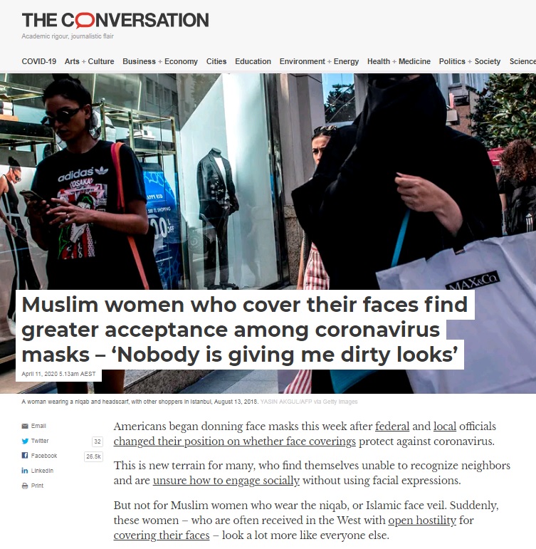 দ্য কনভার্সেশন গত ১১ এপ্রিল লেখক ও গবেষক Anna Piela এর একটি নিবন্ধ প্রকাশ করে যার শিরোনাম ছিলো, "Muslim women who cover their faces find greater acceptance among coronavirus masks – 'Nobody is giving me dirty looks".