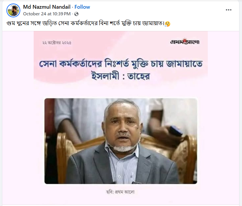 সামাজিক যোগাযোগ মাধ্যম ফেসবুকের বিভিন্ন আইডি ও পেজ থেকে জাতীয় দৈনিক প্রথম আলোর লোগোযুক্ত একটি ফটোকার্ড পোস্ট করে দাবি করা হচ্ছে, গুম খুনের সঙ্গে জড়িত সেনা কর্মকর্তাদের বিনা শর্তে মুক্তি চেয়েছেন জামায়াত ইসলামীর নায়েবে আমির ডা. সৈয়দ আব্দুল্লাহ মোহাম্মাদ তাহের। এরকম কয়েকটি পোস্ট দেখুন এখানে এবং এখানে।