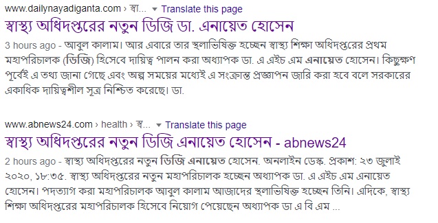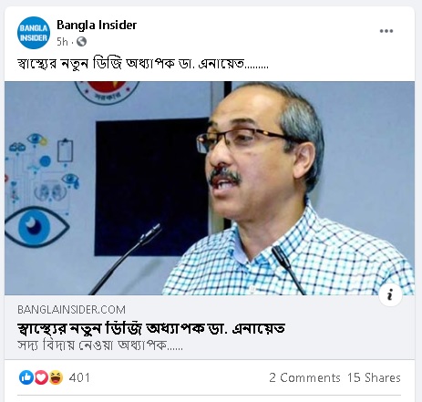 স্বাস্থ্য অধিদপ্তরের নতুন মহাপরিচালক হিসেবে অধ্যাপক ডা. এ এইচ এম এনায়েত হোসেন দায়িত্বপ্রাপ্ত হয়েছেন বলে একটি খবর যুগান্তর, নয়াদিগন্তসহ মূলধারার বেশ কয়েকটি সংবাদমাধ্যমসহ বিভিন্ন অনলাইন পোর্টালে প্রকাশিত হয়েছে। এরপরই খবরটি সামাজিক মাধ্যমেও ছড়িয়ে পড়ে।