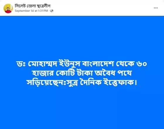 গত ১৪ সেপ্টেম্বর 'সিলেট জেলা ছাত্রলীগ' নামে একটি ফেসবুক পেজে পোস্ট করে বলা হয়, "ডঃ মোহাম্মদ ইউনুস বাংলাদেশ থেকে ৬০ হাজার কোটি টাকা অবৈধ পথে সড়িয়েছেনঃসুত্র দৈনিক ইত্তেফাক।"। ফেসবুক পোস্টটির স্ক্রিনশট দেখুন--