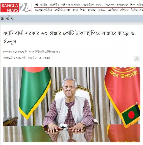 পরবর্তীতে কি-ওয়ার্ড সার্চ করে গত ১১ সেপ্টেম্বর অনলাইন পোর্টাল বাংলানিউজের ওয়েবসাইটে "ফ্যাসিবাদী সরকার ৬০ হাজার কোটি টাকা ছাপিয়ে বাজারে ছাড়ে: ড. ইউনূস" শিরোনামে একটি প্রতিবেদন খুঁজে পাওয়া যায়। উক্ত প্রতিবেদনে বলা হয়, "জাতির উদ্দেশে ভাষণে অন্তর্বর্তী সরকারের প্রধান উপদেষ্টা ড. মুহাম্মদ ইউনূস বলেছেন, ফ্যাসিবাদী সরকার লুটপাট করার জন্য নতুন করে ৬০ হাজার কোটি টাকা ছাপিয়ে বাজারে ছাড়ার কারণে মুদ্রাস্ফীতির শিকার হয়েছে দেশের মানুষ। এই অতুলনীয় মুদ্রাস্ফীতি নিয়ন্ত্রণ অন্তর্বর্তী সরকারের অন্যতম প্রধান লক্ষ্য।" স্ক্রিনশট দেখুন--