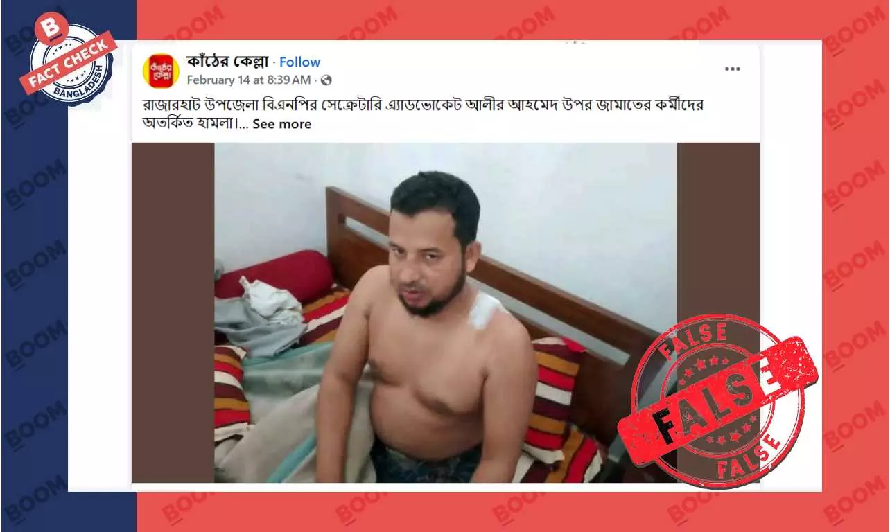 সামাজিক যোগাযোগ মাধ্যম ফেসবুকের বিভিন্ন আইডি ও পেজ থেকে একজন ব্যক্তির ছবি পোস্ট করে দাবি করা হচ্ছে, রাজারহাট উপজেলা বিএনপির সেক্রেটারি এ্যাডভোকেট আলীর আহমেদ উপর জামায়াত নেতা-কর্মীরা হামলা করেছে। এরকম দুটি পোস্ট দেখুন এখানে এবং এখানে।