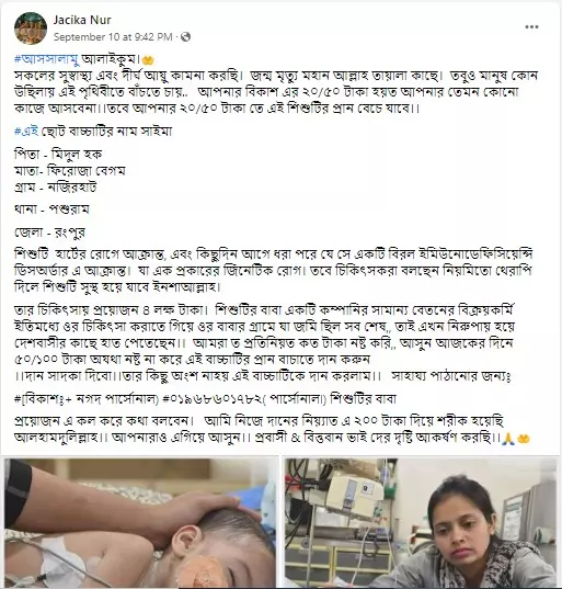 গত ১০ সেপ্টেম্বর "amdadul_10" নামের একটি পাবলিক গ্রুপে "Jacika Nur" নামের একটি আইডি থেকে একটি অসুস্থ শিশুর ছবি শেয়ার করে বলা হয়, "..........#এই ছোট বাচ্চাটির নাম সাইমা। পিতা - মিদুল হক, মাতা- ফিরোজা বেগম, গ্রাম - নজিরহাট, থানা - পশুরাম, জেলা - রংপুর। শিশুটি হার্টের রোগে আক্রান্ত, এবং কিছুদিন আগে ধরা পরে যে সে একটি বিরল ইমিউনোডেফিসিয়েন্সি ডিসঅর্ডার এ আক্রান্ত। যা এক প্রকারের জিনেটিক রোগ। তার চিকিৎসায় প্রয়োজন ৪ লক্ষ টাকা।" উক্ত পোস্টে আর্থিক সাহায্য পাঠানোর জন্য মুঠোফোনে আর্থিক লেনদেন সেবাদাতা প্রতিষ্ঠান বিকাশ ও নগদের ফোন নম্বর যুক্ত করা হয়েছে। ফেসবুক পোস্টটির স্ক্রিনশট দেখুন--