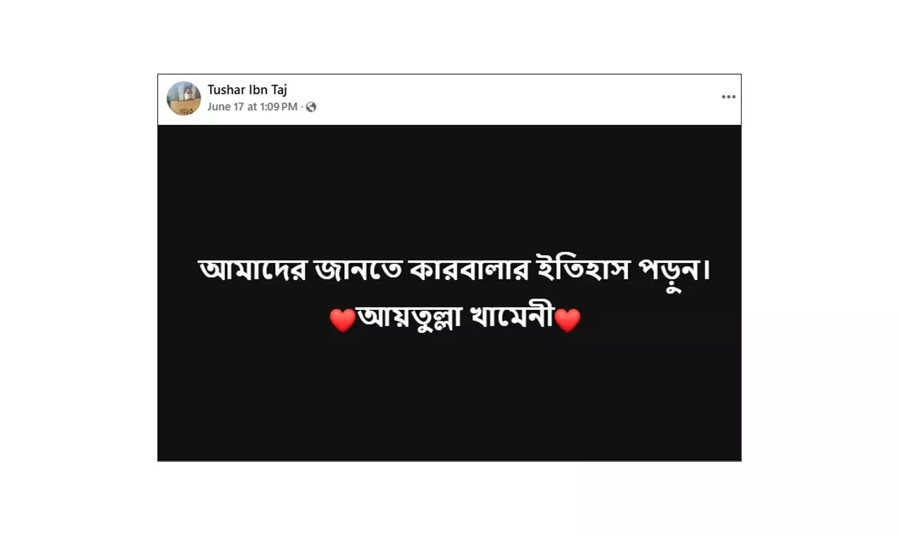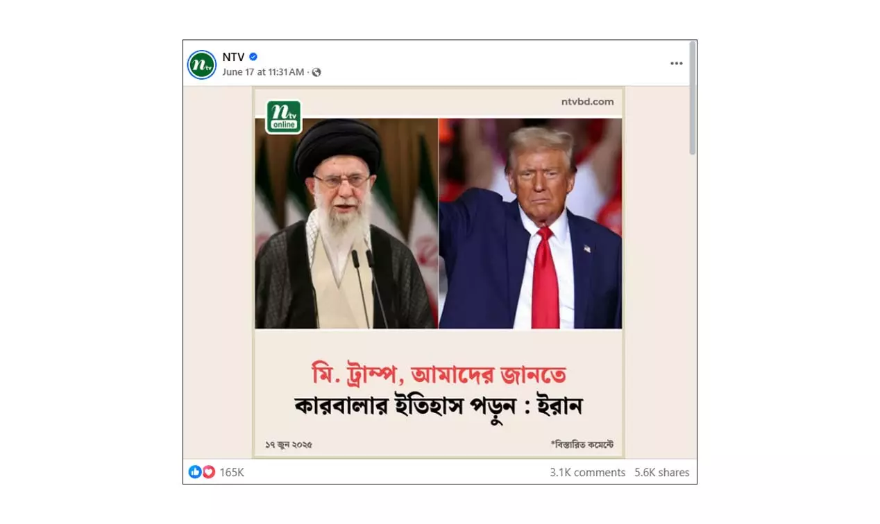 গত ১৭ জুন বেসরকারি সম্প্রচার মাধ্যম ‘এনটিভি’র ভেরিফাইড ফেসবুক পেজে এ সংক্রান্ত একটি ফটোকার্ড পোস্ট করা হয়। ফটোকার্ডে উল্লেখ করা হয়, “মি. ট্রাম্প, আমাদের জানতে কারবালার ইতিহাস পড়ুন: ইরান”। পোস্টটির স্ক্রিনশট দেখুন--