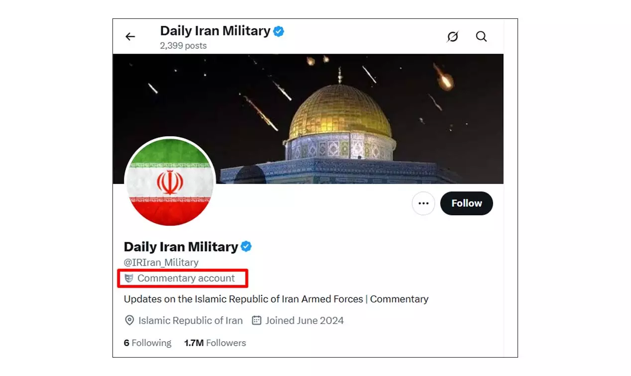 সার্চ করে ফেসবুকে 'Iran Military' নামক (ভেরিফাইড নয়) একটি ফেসবুক পেজে পোস্টটি পাওয়া যায়। পেজটিতে তাদের এক্স (সাবেক টুইটার) অ্যাকাউন্টটির লিংকও পাওয়া যায়। অ্যাকাউন্টটিতে প্রবেশ করে দেখা যায় এটি 'Commentary Account' হিসেবে লেবেলড করা। দেখুন--