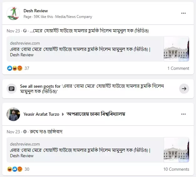 ফেসবুকে একটি খবর দেখা যাচ্ছে যেখানে দাবি করা হচ্ছে মাওলানা মামুনুল হক বোমা মেরে হোয়াইট হাউজ হামলার হুমকি দিয়েছেন। দেখুন এখানে, এখানে এবং এখানে।