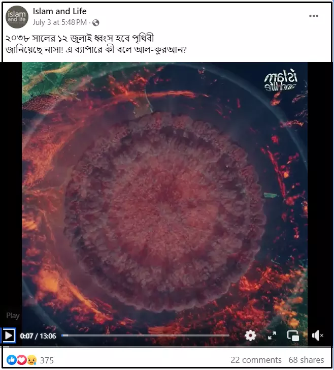 গত ৩ জুলাই 'Islam and Life' নামের পেজ থেকে ভিডিওটি পোস্ট করে লেখা হয়, "২০৩৮ সালের ১২ জুলাই ধ্বংস হবে পৃথিবী | জানিয়েছে নাসা! | এ ব্যাপারে কী বলে আল-কুরআন?"। পোস্টটির স্ক্রিনশট দেখুন--