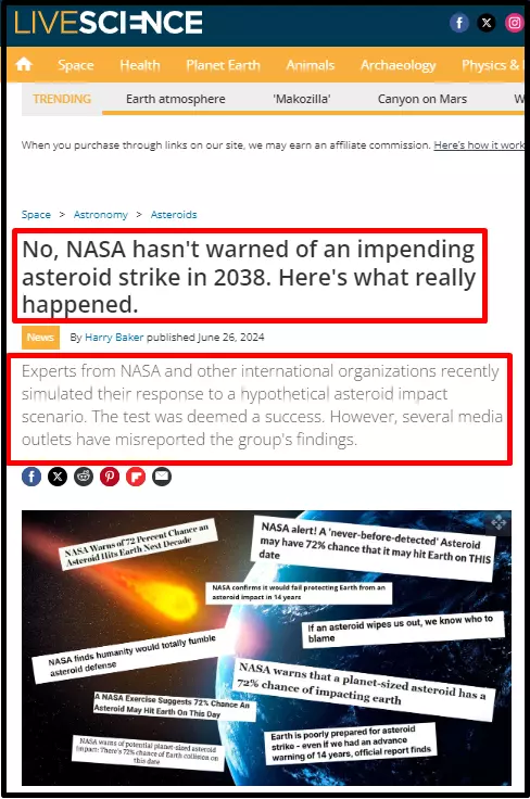 বিষয়টি নিয়ে কি-ওয়ার্ড সার্চ এর মাধ্যমে বিজ্ঞান বিষয়ক জনপ্রিয় সাইট 'লাইভ সায়েন্স'-এ গত ২৬ জুন "No, NASA hasn't warned of an impending asteroid strike in 2038. Here's what really happened." শিরোনামে প্রকাশিত একটি প্রতিবেদন খুঁজে পাওয়া যায়। এতে উল্লেখ করা হয়, নাসা এবং অন্যান্য আন্তর্জাতিক সংস্থার বিশেষজ্ঞরা সম্প্রতি কল্পিত গ্রহাণু পৃথিবীতে আছড়ে পড়লে তার প্রভাব অনুমান করে সেই অনুযায়ী প্রতিক্রিয়া এবং করণীয় বিষয়ে অনুশীলন করেছেন। এই অনুশীলনে উদ্দেশ্য অনুযায়ী সফলও হয়েছেন তারা। কল্পিত বিষয়টিকে সত্য মনে করে তথা ২০৩৮ সালে গ্রহাণু আঘাত করবে এমন সিদ্ধান্তমূলক বিভ্রান্তিকর তথ্য প্রচার করা হয়েছে। প্রতিবেদনটির স্ক্রিনশট দেখুন--