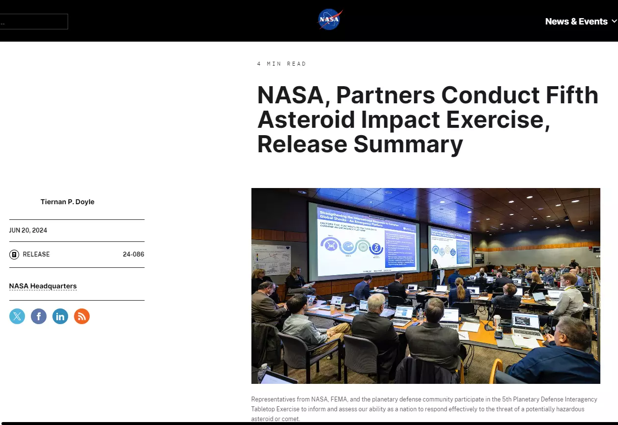 এতে উল্লেখ করা হয়, NASA এর প্ল্যানেটারি ডিফেন্স কো-অর্ডিনেশন অফিস, FEMA (ফেডারেল ইমার্জেন্সি ম্যানেজমেন্ট এজেন্সি) এর সাথে অংশীদারিত্বে এবং মার্কিন যুক্তরাষ্ট্রের স্টেট অফিস অব স্পেস অ্যাফেয়ার্সের সহায়তায়, সম্ভাব্য বিপজ্জনক গ্রহাণু বা ধূমকেতুর আছড়ে পড়ার হুমকি মোকাবেলায় কার্যকরভাবে প্রতিক্রিয়া জানানো এবং মূল্যায়ন করার জন্য একটি মহড়ার আয়োজন করা হয়েছিল।