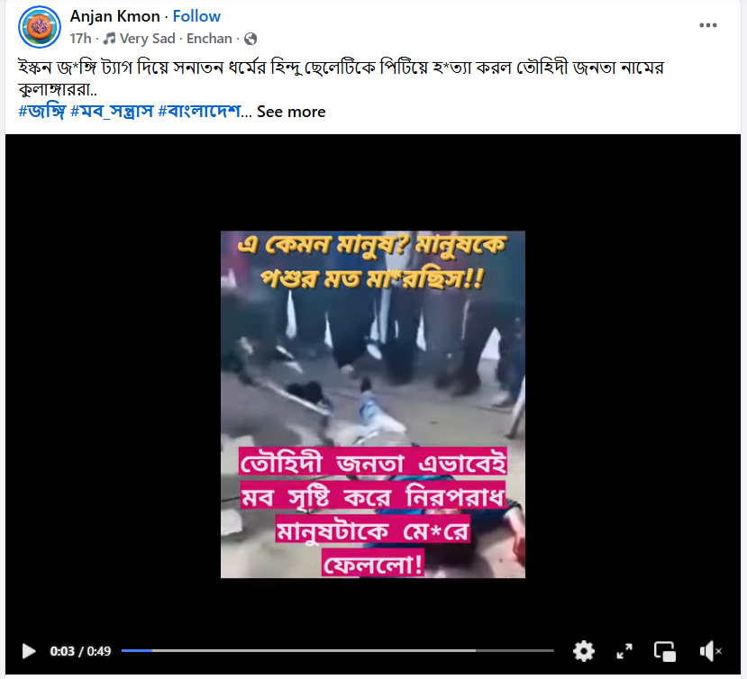 গত ৩০ অক্টোবর ‘Anjan Kmon’ নামক একটি আইডি থেকে একটি ভিডিও পোস্ট করে উল্লেখ করা হয়, “ইস্কন জ*ঙ্গি ট্যাগ দিয়ে সনাতন ধর্মের হিন্দু ছেলেটিকে পিটিয়ে হ*ত্যা করল তৌহিদী জনতা নামের কুলাঙ্গাররা.. #জঙ্গি #মব_সন্ত্রাস #বাংলাদেশ।” নিচে পোস্টটির স্ক্রিনশট দেখুন--