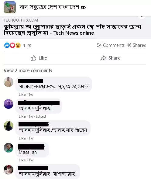 সামাজিক মাধ্যমে 'কুমিল্লায় অ'স্ত্রোপচার ছাড়াই একস'ঙ্গে পাঁচ স'ন্তানের জ'ন্ম দিয়েছেন প্রসূতি মা' শিরোনামে একটি খবর বিভিন্ন অনলাইন পোর্টালের সূত্রে বিভিন্ন প্রোফাইল ও পেজ থেকে ছড়ানো হচ্ছে। কিছু পোর্টালের খবর দেখুন এখানে ও এখানে।