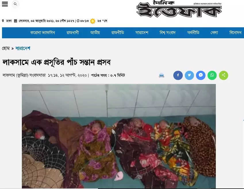 প্রকৃতপক্ষে গত আগস্টে কুমিল্লার লাকসাম জেনারেল হসপিটালে একসাথে পাঁচ সন্তান প্রসবের ঘটনা ঘটলে জাতীয় দৈনিক ইত্তেফাকের অনলাইনে প্রকাশিত খবর থেকে হুবহু কপি করে এবং কপিরাইট এড়াতে অযাচিতভাবে কিছু যতি চিহ্ন ব্যবহার করে এখন তা বিভিন্ন পোর্টালে ও সামাজিক মাধ্যমে ছড়ানো হচ্ছে। ২০২০ সালের ১২ আগস্টের ইত্তেফাকের প্রতিবেদন অনুযায়ী-