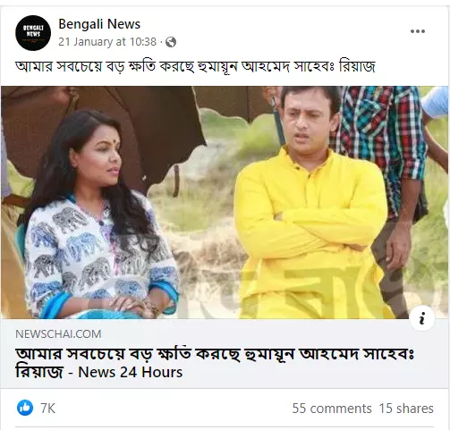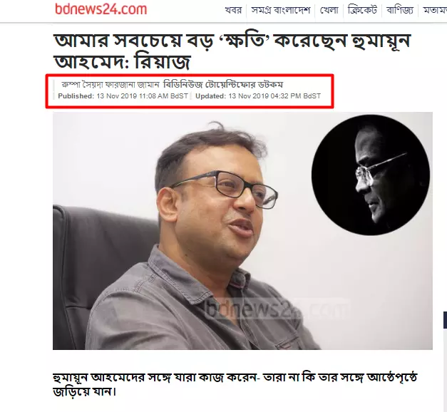 গত ২১ জানুয়ারি 'Bengali News' নামের ফেসবুক পেজ থেকে একটি খবরের লিংক পোস্ট করে বলা হয়, 'আমার সবচেয়ে বড় ক্ষতি করছে হুমায়ূন আহমেদ সাহেবঃ রিয়াজ'। হুবহু একই শিরোনামে প্রকাশিত খবরটির বিস্তারিত অংশে বলা হয়, এক সাক্ষাৎকারে নায়ক রিয়াজ বলেছেন, 'আমার জীবনের সবচেয়ে বড় ক্ষতিটা হুমায়ূন আহমেদই করেছেন।' কারণ হিসেবে তিনি উল্লেখ করেন, হুমায়ুন আহমেদ রিয়াজের সিনেমা সংক্রান্ত ভাবনাগুলোকে বদলে দিয়েছিলেন। দেখুন--
