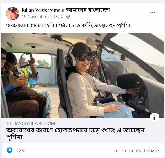 সামাজিক মাধ্যম ফেসবুকে একটি খবরের লিংক শেয়ার বলা হচ্ছে, অবরোধের কারণে হেলিকপ্টারে করে শুটিং এ যাচ্ছেন নায়িকা পূর্ণিমা। দেখুন এমন দুটি পোস্ট এখানে এবং এখানে।