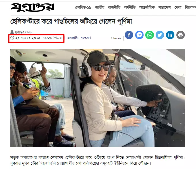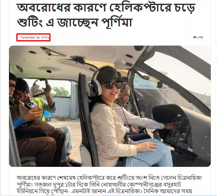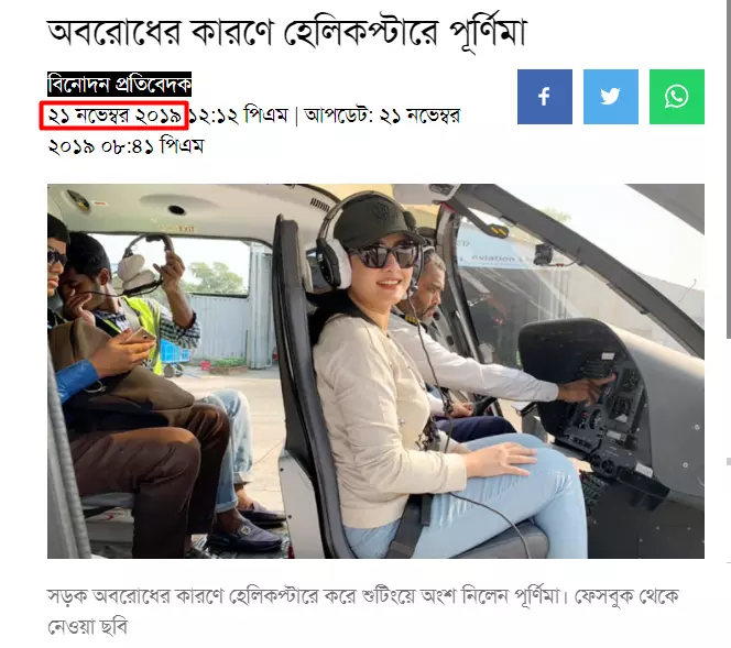 অর্থাৎ ২০১৯ সালে পূর্ণিমার হেলিকপ্টারে করে শুটিংয়ে যাওয়ার খবর পুনরায় ২০২১ সালে নতুন দিন তারিখ দিয়ে হুবহু প্রকাশ করা হচ্ছে যা বিভ্রান্তিকর।