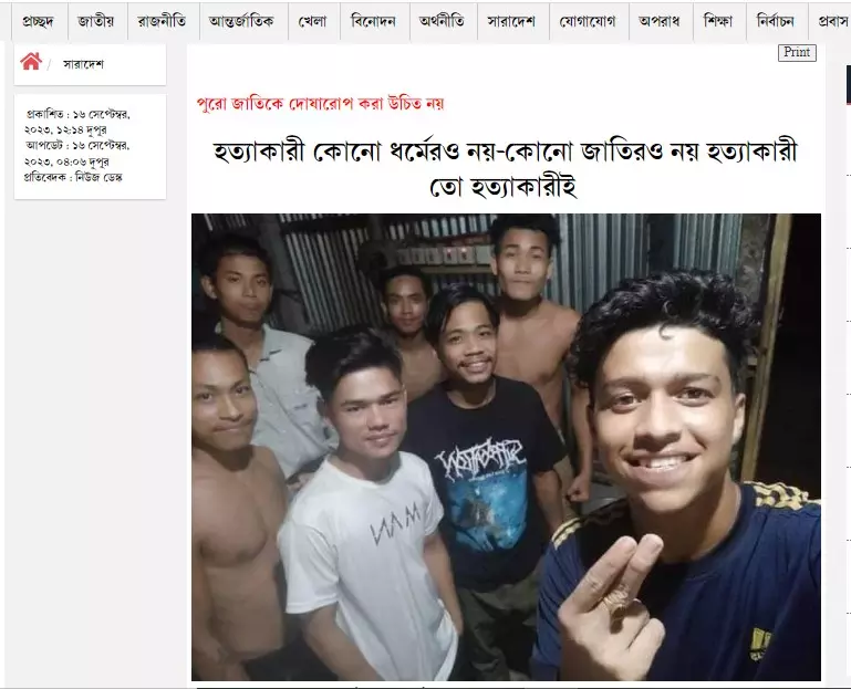 আলোচ্য পোস্টে একটি স্থিরচিত্র যুক্ত করা হয়। স্থিরচিত্রটির রিভার্স ইমেজ সার্চ করে অনলাইন পোর্টাল আমাদের সময় ডট কমে ১৬ সেপ্টেম্বর ২০২৩ সালে "পুরো জাতিকে দোষারোপ করা উচিত নয়- হত্যাকারী কোনো ধর্মেরও নয়-কোনো জাতিরও নয় হত্যাকারী তো হত্যাকারীই" শিরোনামে প্রকাশিত একটি প্রতিবেদনে ওই স্থিরচিত্রটি খুঁজে পাওয়া যায়। এই প্রতিবেদন থেকে জানা যায়, চট্টগ্রামের রাউজানে শিবলী সাদিক হৃদয় নামের এক কলেজছাত্র তার ক্ষুদ্র নৃগোষ্ঠীর কয়েকজন বন্ধুর হাতে খুন হওয়ার অভিযোগ উঠেছে। ছবিটিতে হৃদয় এবং তার সেই ক্ষুদ্র নৃগোষ্ঠীর বন্ধুদের দেখা যাচ্ছে। স্ক্রিনশট দেখুন--
