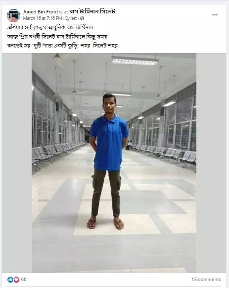 গত ১৬ মার্চ 'Juned Bin Forid' নামে একটি আইডি থেকে একটি ছবি পোস্ট করে বলা হয়, "এশিয়ার সর্ব বৃহত্তম আধুনিক বাস টার্মিনাল আজ প্রিয় নগরী সিলেট বাস টার্মিনালে কিছু সময় বলতেই হয় "দুটি পাতা একটি কুড়ি" শহর সিলেট শহর।" ফেসবুক পোস্টটি দেখুন--