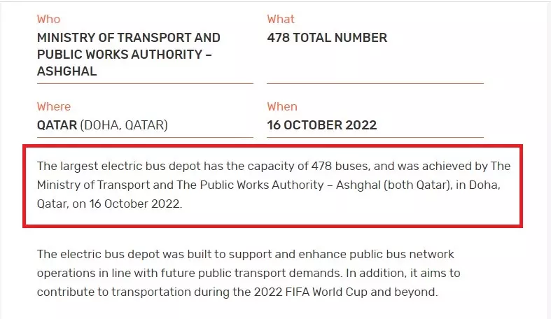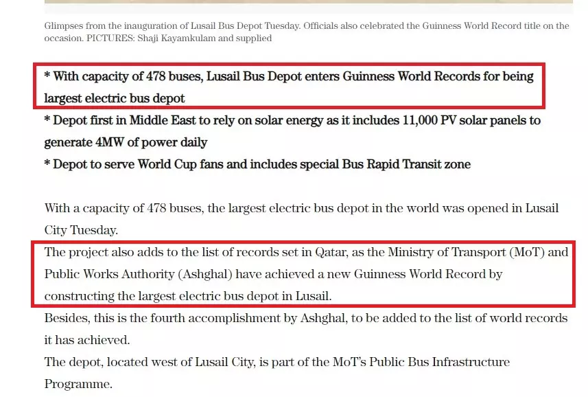 এদিকে, বিশ্বের রেকর্ড সংরক্ষণকারী প্রতিষ্ঠান গিনেস ওয়ার্ল্ড রেকর্ডসের ওয়েবসাইটে গিয়ে 'Largest electric bus depot' শিরোনামে একটি রেকর্ড খুঁজে পাওয়া যায়। ওই রেকর্ড থেকে জানা যায়, ৪ লক্ষ স্কয়ার মিটার আকার এবং ৪৭৮টি বাসের ধারণক্ষমতাবিশিষ্ট লুসাইল বাস ডিপো বিশ্বের বৃহত্তম বৈদ্যুতিক বাস টার্মিনাল। তবে, গিনেস ওয়ার্ড রেকর্ডসের অন্তর্ভুক্ত হওয়ার পরে টার্মিনালটির বাস ধারনক্ষমতা বৃদ্ধি করা হয়েছে। স্ক্রিনশট দেখুন--