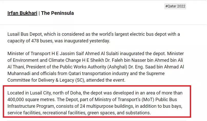 আরো সার্চ করে কাতারভিত্তিক গণমাধ্যম দ্য পেনিনসুলা এর ওয়েবসাইটে 'Eco-friendly electric bus depot opens in Lusail' শিরোনামে একটি প্রতিবেদন খুঁজে পাওয়া যায়। ওই প্রতিবেদন থেকে জানা যায়, কাতারের লুসাইল শহরে ৪ লক্ষ স্কয়ার ফিটের ওই বৈদ্যুতিক বাস টার্মিনালটি তৈরি করা হয়েছে। স্ক্রিনশট দেখুন--